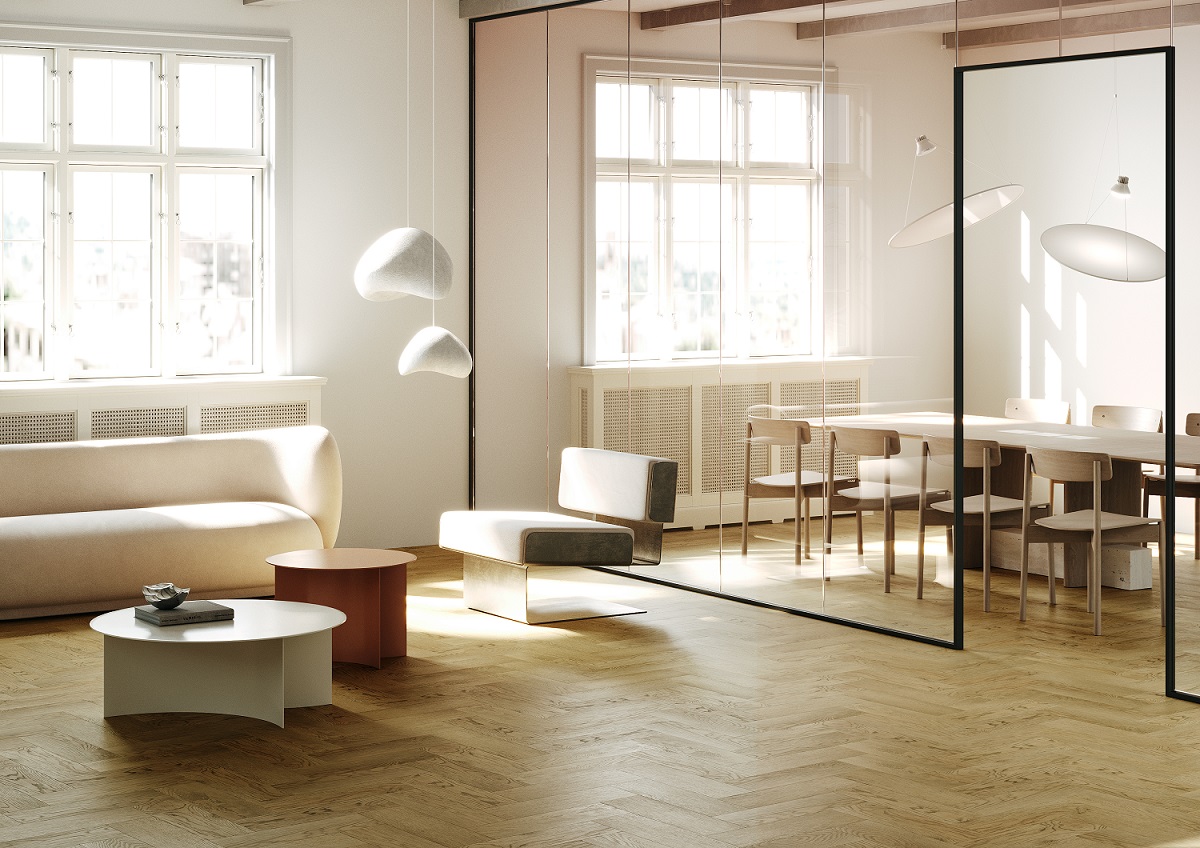 Узоры «елочка» всегда привлекают внимание и делают помещения более живыми и динамичными. Такой пол идеально подходит для классических и современных интерьеров. А уникальный маленький размер плашек позволяет использовать кварцевый ламинат из коллекции FARGO Herringbone в самых маленьких комнатах.