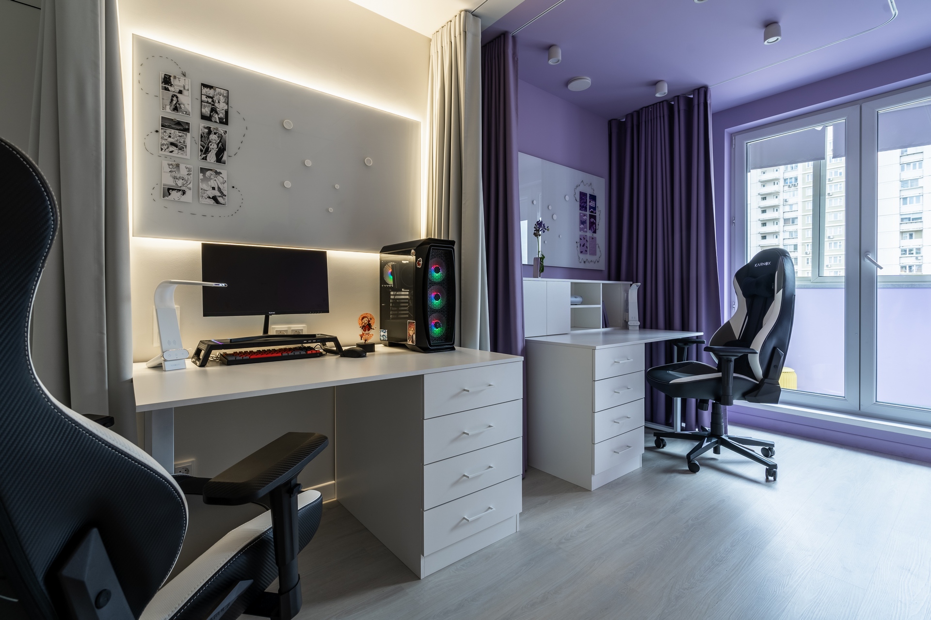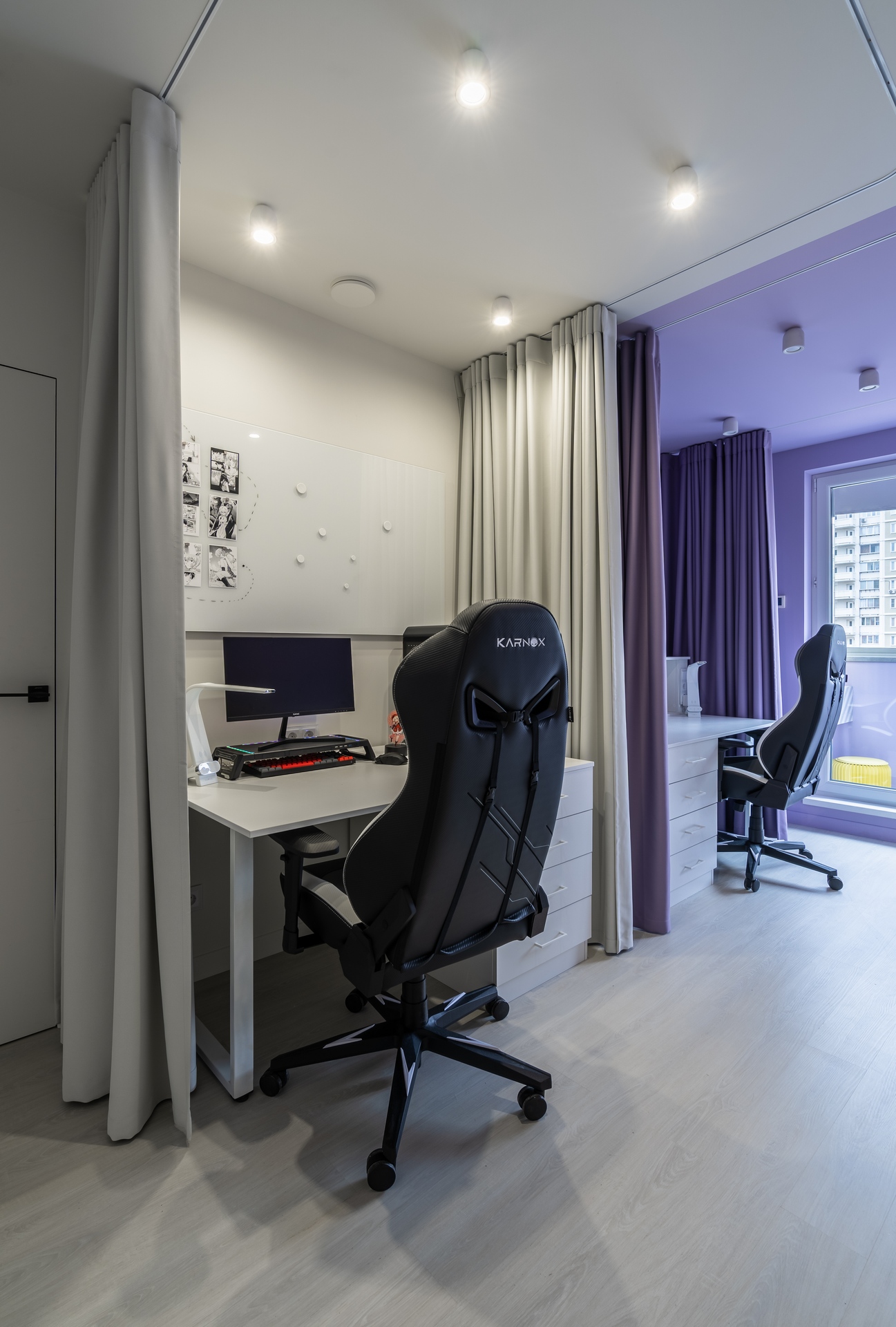 Эта детская родилась по острому запросу на разделение пространства. Дизайнеры «Квартирного вопроса» решили его нестандартным способом, и в новой детской теперь много воздуха, при этом у каждой из 3 сестёр есть своё пространство, а в центре комнаты появилось общее место для совместных игр.