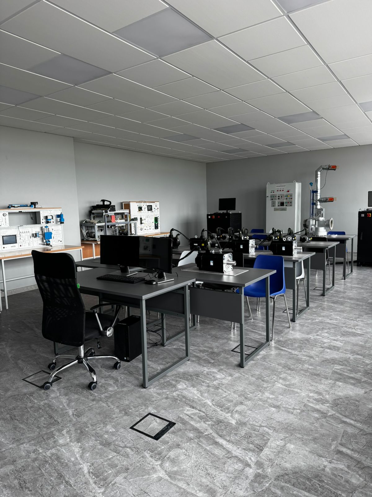 Дымчатый меланит - стильный и современный дизайн кварцевого ламината под камень, который подчеркнул динамичный минимализм Факультета мехатроники и робототехники.
